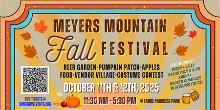 Celebrate the season at the 2nd Annual Meyers Mountain Fall Festival at Tahoe Paradise Park next weekend! Enjoy two full days of community fun with live music—Bison & Jelly Bread on Saturday and CB Radio & Broken Compass Bluegrass on Sunday—plus performances by dancers from The Studio and the STHS cheer and dance team!